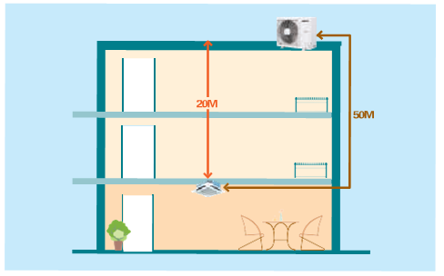 Long Piping Desig n Due to the new control method, the actual piping length is up to 50m and pipe height can be up to 20m, which makes installation easier and more flexible. |