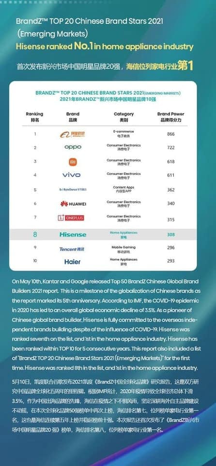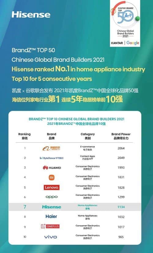 Hisense đã tự hào đứng thứ 7 trong danh sách và đứng thứ 1 trong ngành thiết bị gia dụng và Hisense đã 5 năm liên tiếp nằm trong top 10.
