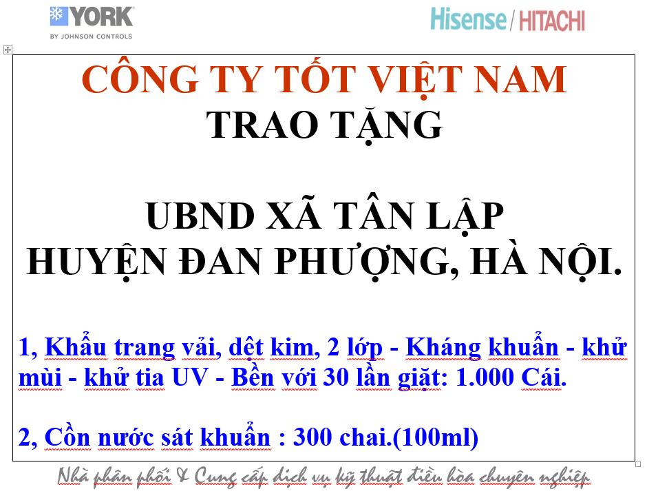 Hưởng ứng chỉ thị phòng, chống dịch COVID-19 của Thủ tướng chính phủ. Tập thể lãnh đạo, nhân viên Công ty Tốt Việt Nam ngoài việc thực hiện đúng những quy định của cơ quan chức năng mà còn rất vui mừng khi được đóng góp một phần công sức của mình vào công cuộc phòng, chống dịch COVID-19 trên khắp cả nước. Bằng hành động thực tế, Công ty đã dành những phần quà nhỏ trao tặng chính quyền Xã Tân Lập, Huyện Đan Phượng, Hà Nội bao gồm: